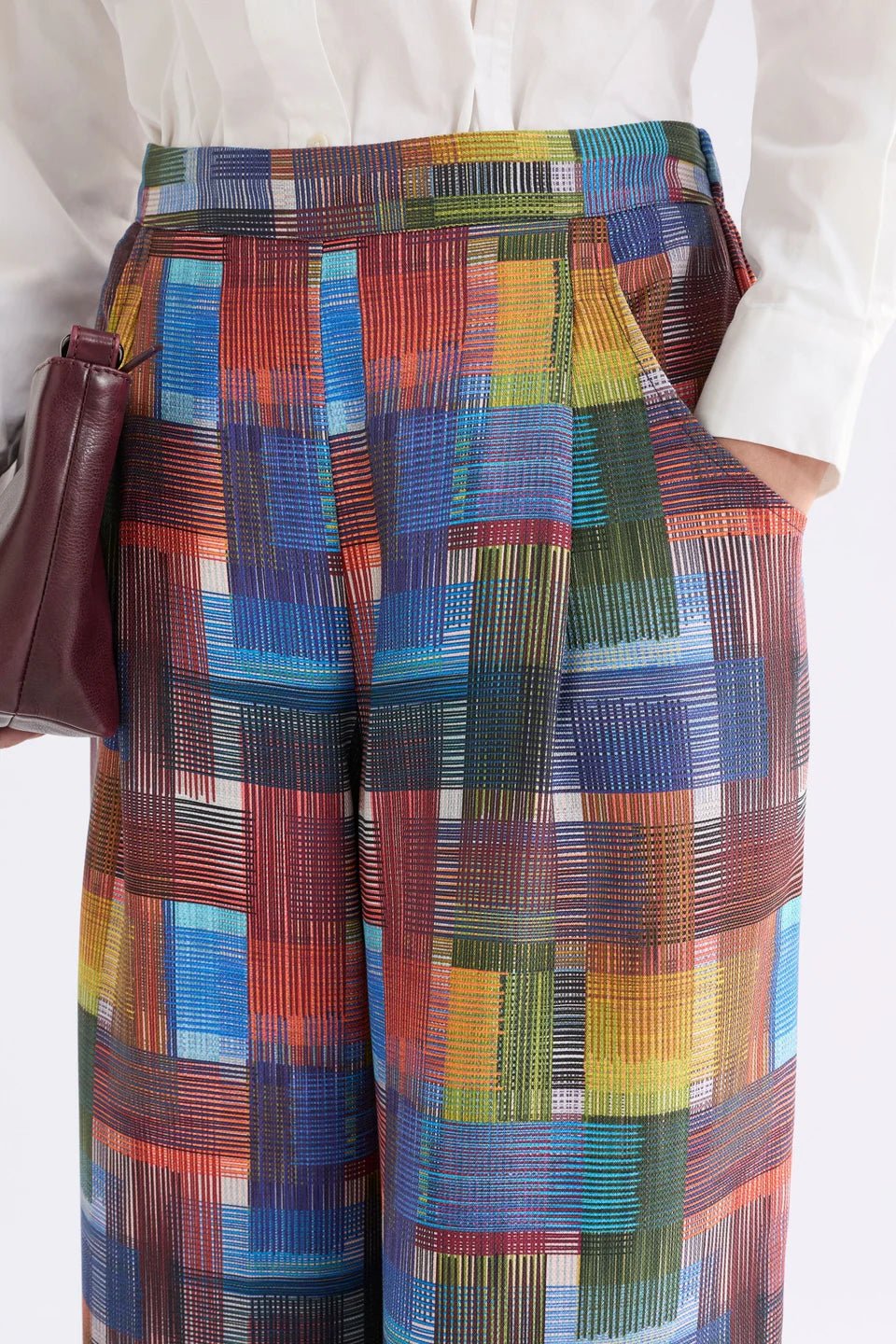 The Seine Pant is playful, smart pant crafted from 100% TENCEL™ Lyocell featuring the striking Elbrus Print of deconstructed multi-coloured checks. This regular fit, tailored pant has a flat front waistband with elastic back and internal drawstring waist tie, for a comfortable adjustable fit. Finished with curved front pockets, and back patch pockets, along with a front tuck. Designed to finish at or just below the ankle bone. Pair with simple, plain tops or the matching Eir sheer Shirt for a full head-to-toe statement look.