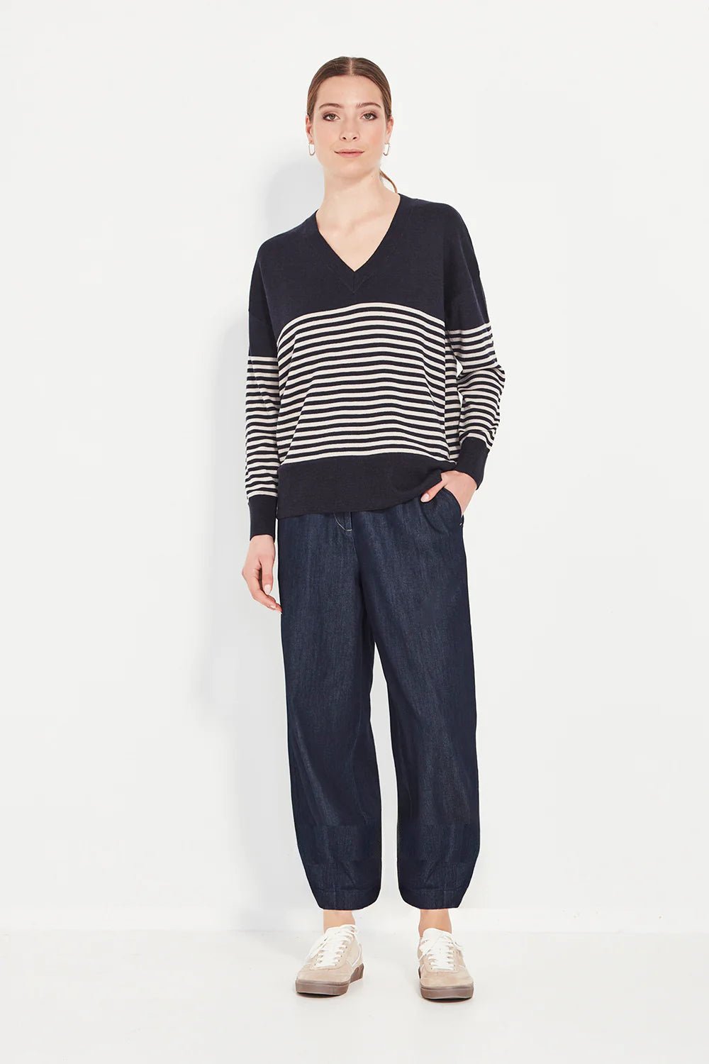 The Unit Pant brings a modern take to everyday denim. Cut from a soft dark-denim fabric, it features a gently structured barrel-leg silhouette that gives the style its contemporary shape. The fly front with front pleat adds subtle tailoring, while the elasticated back waist ensures comfort and ease of movement.
