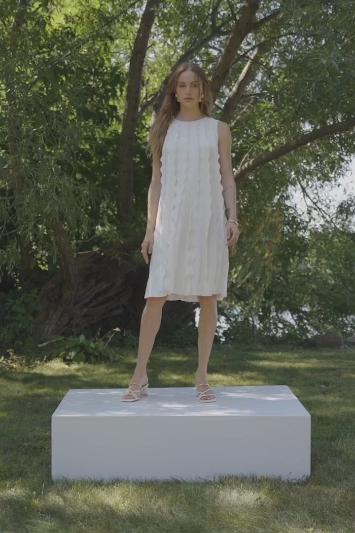 Crafted in beautiful knit fabric, this sleeveless A-line dress features a scoop neckline and allover 3D scallop appliqués for subtle texture. Finished with a back tie, it falls above the knee for a modern, playful finish.